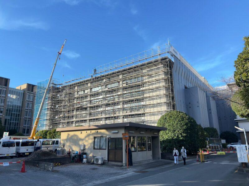 ※現在の医学部研究棟別館の様子:外壁のシートが一部外されました。工事も順調に進行中です。